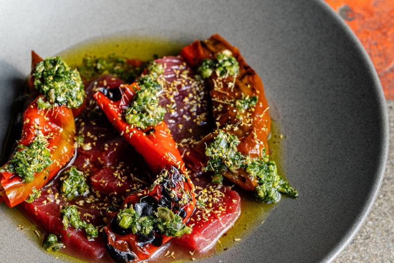 Ladder 4's menu contains modern takes on bistro classics like tuna crudo with tomato water, fennel pollen and blistered peppers from its nearby garden