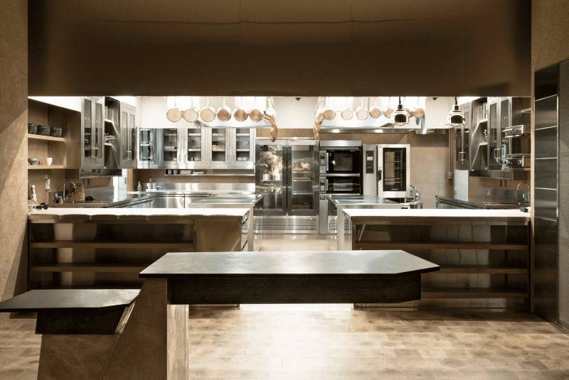 San's kitchen space and dining room flow into each other, with neutral tones and soft stone complementing the delicate dish presentation